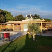 Abri toit plat installé en bord de piscine.Une porte vitrée en PVC et une porte 2 ventaux.