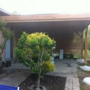 Combiné entre un abri et un carport, toiture plate bac acier.Sur le fond de la structure entre la paroi de l'abri et le poteau du carport, nous avons installé des claires voies...